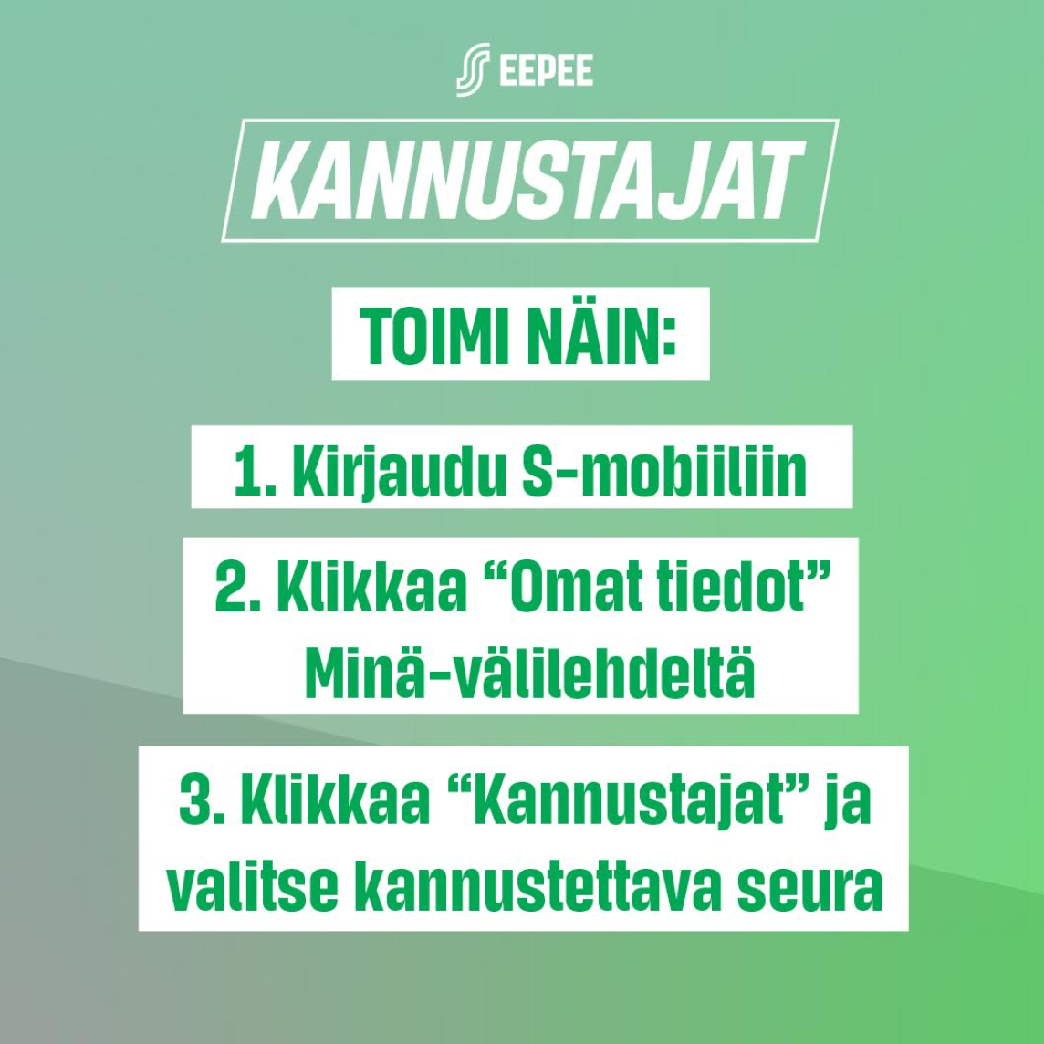 Etelä-Pohjanmaan Osuuskauppa jakaa tänäkin vuonna 100 000 € alueen lasten ja nuorten harrastustoimintaan. Sinä Eepeen asiakasomistajana voit ryhtyä Kannustamaan meitä helposti S-mobiilissa. Kannustaminen on hyvin yksinkertaista: ryhdy Kannustajaksi S-mobiilissa ja kerää S-ryhmän Bonuksia! Kannustaminen ei vähennä sinun Bonuksiasi, mutta vaikuttaa Kannustettavan seuran tukipottiin. Aika win-win-tilanne. Kaiken lisäksi tukipottiin vaikuttaa koko vuoden aikana keräämäsi Bonus, joten vielä ei tosiaankaan ole myöhäistä ryhtyä Kannustajaksi!
